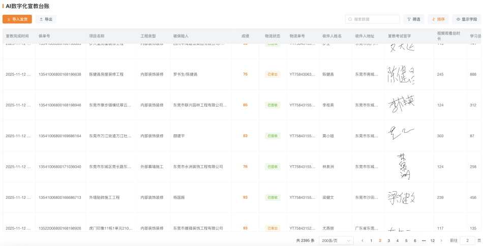 转变一:监管模式由“被动应对”转向“精准预防”,推行“AI数字化宣教”限额以下工程受限于项目规模与作业空间,风险场景相对单一,但施工作业人员存在安全意识差、安全技能弱、防护物资少、人员流动频等常见问题,生产安全事故往往源自人的不安全行为(如人员违规作业、未正确使用安全保护用品等)以及环境的不安全因素(如吊装、动火、临时用电等危险作业未落实安全措施等)。针对上述风险特点,东莞市引入AI数字化宣教”,分析往年事故数据,拆解高危风险因素,按照建筑施工类型分别制作安全教育短视频及知识题库。施工单位投保安责险后通过手机扫码,5分钟内完成安全视频学习、应知应会测试、领取安全物资及保单下载,针对安全知识学习情况,后台AI运算建立风险画像,为精准宣教工作提供支撑,实现宣教“被动应对”转向“精准预防”。